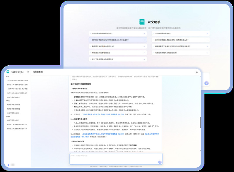 通过对话即可查阅全校1000+份制度文件、办事指南、部门黄页,动动手指即可秒速获取。对学生:提供目前学校...