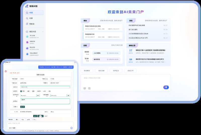 传统门户中待办、消息、通知等通用能力直接嫁接到AI融合门户中,结合流程智改,借助大模型能力理解用户意图...